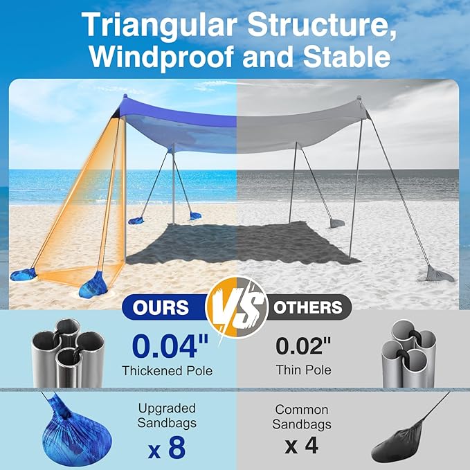 - Improved Stability, Resist High Wind: Our upgraded beach tent is equipped with 8 sandbags, 4 thickened aluminum poles and 4 windproof ropes, sturdy connection withstand high winds. Besides, our beach canopy is attached to the sandbags with high quality nylon ropes, making it more stable and longer lasting.
