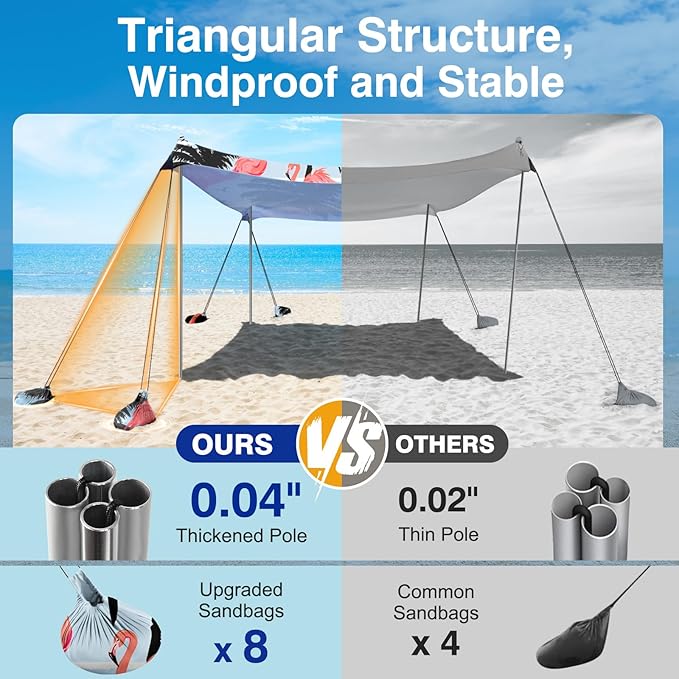 - Improved Stability, Resist High Wind: Our upgraded beach tent is equipped with 8 sandbags, 4 thickened aluminum poles and 4 windproof ropes, sturdy connection withstand high winds. Besides, our beach canopy is attached to the sandbags with high quality nylon ropes, making it more stable and longer lasting.