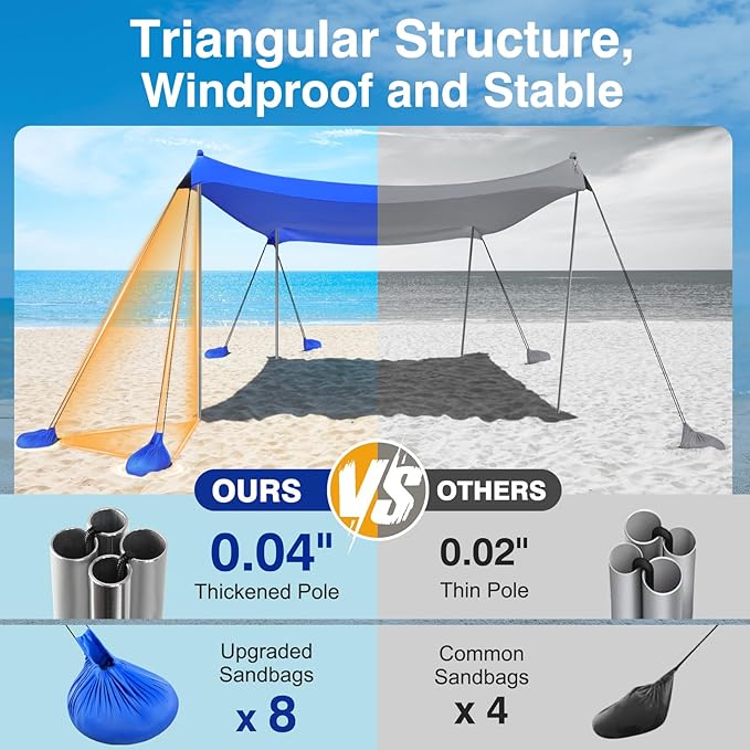 - Improved Stability, Resist High Wind: Our upgraded beach tent is equipped with 8 sandbags, 4 thickened aluminum poles and 4 windproof ropes, sturdy connection withstand high winds. Besides, our beach canopy is attached to the sandbags with high quality nylon ropes, making it more stable and longer lasting.