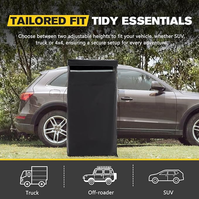 - Tailored Fit, Tidy Essentials: Choose between two adjustable heights to fit your vehicle, whether SUV, truck or 4x4, ensuring a secure setup for every adventure. Store your shampoo, towels, and clothes in pockets with flaps to block splashes. Plus, the silver color ensures visibility even in low-light conditions.