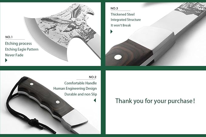 - Beautiful appearance: This survival axe has a beautiful curve, multiple polishing on the surface, smooth chamfers, and the eagle pattern on the axe body using etching technology, which remains clear even after long-term use.