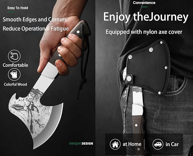 - Multifunction Camping axe:This viking axe has a wide range of uses, including outdoor camping, daily household use, wilderness exploration, hunting, fishing, chopping wood, and is also a great gardening axe.