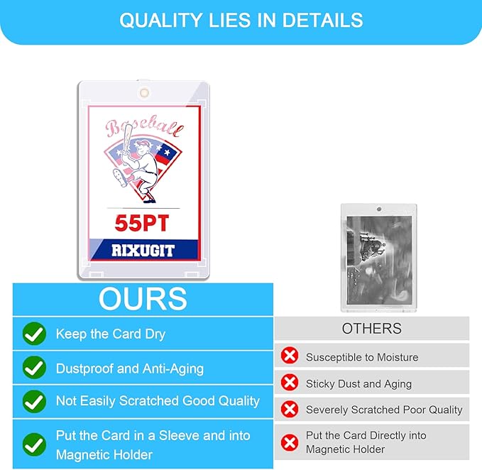 - Quality assurance: We are committed to providing customers with high-quality products. 55PT card bricks undergo strict quality testing to ensure that every product meets high standards. We believe that this card tile will become a valuable assistant on your collection journey, providing the best solution for protecting and showcasing your cards