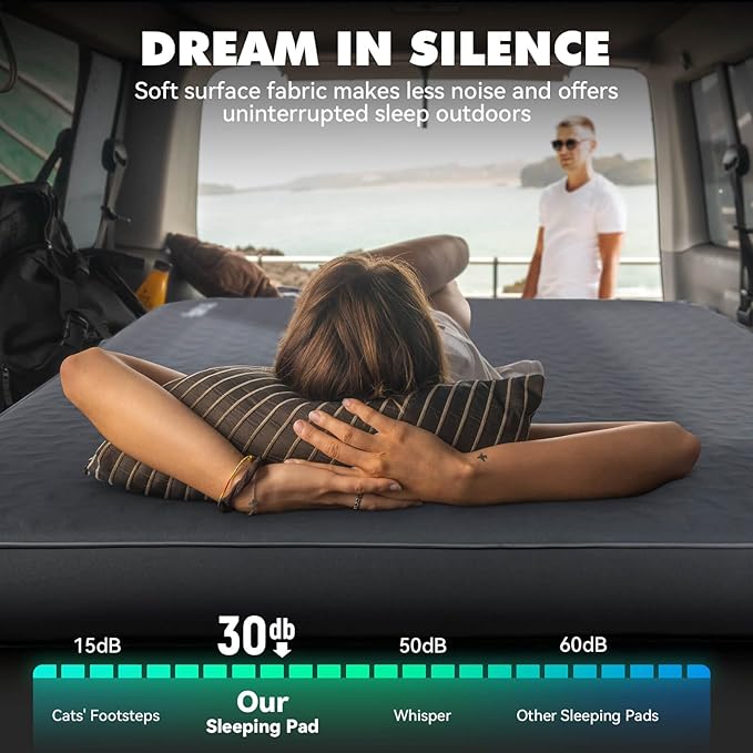 - WHISPER-QUIET NIGHTS UNDER STARS - Our 2 person sleeping pad with stretch-knit fabric surface combines whisper-soft comfort with noise-free movement. No more crinkly plastic sounds ruining your wilderness zen! Roll over freely without waking tent mates - Our camping mat is ideal for light sleepers and family camping trips where peaceful sleep matters most.
