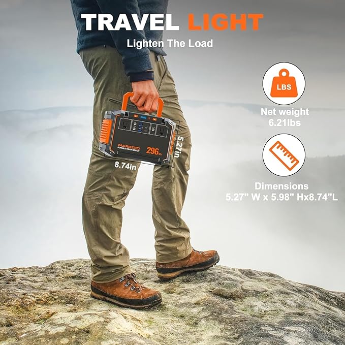 - PORTABLE & CONVENIENT: The M638 Solar Generator with Solar Panel is designed for ultimate portability. With its compact size of 8.74 x 5.27 x 5.98 inches and a lightweight design at just 6.21 lbs, it easily fits into your backpack, car, or suitcase. Whether you're camping, traveling, or need a dependable power source for emergencies, the M638 MAX is the perfect companion, providing reliable power.