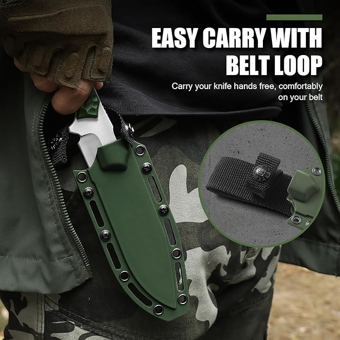 - Green ABS Handle for Comfort and Grip: The ABS handle in an green color provides a secure, ergonomic grip with a textured finish. This fixed blade knife with sheath is designed for steady handling when camping, hiking or other outdoor adventures.
