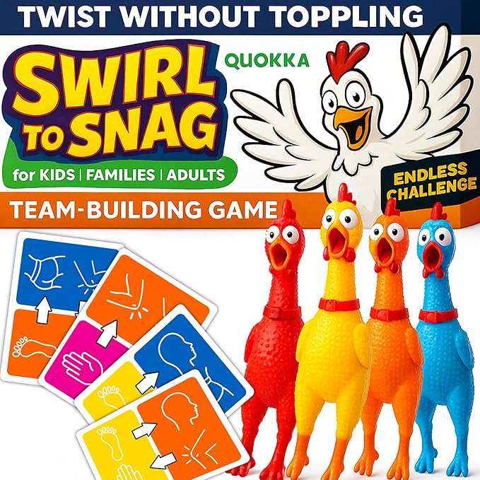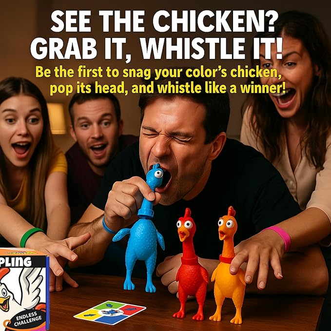 - GRAB THE CHICKEN, WHISTLE TO WIN!: See the chicken card? Be the first to grab your color’s chicken, pop off its head, and whistle your victory; fail to react fast and you're out—it's weird, wild, and unforgettable