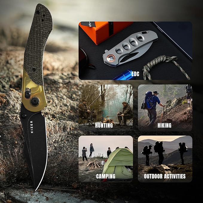 - Innovative Clutch Lock: Kizer small edc camping folding knife features a crossbar locking system with 5 adjustable holes and 25 tension settings, enabling precise control over the opening strength for a fully customized fit