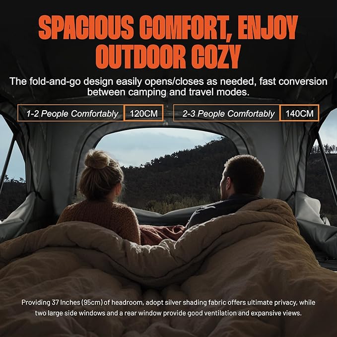 - Comfort & Privacy: The tent provides a spacious 85" L×52" W×59" H space, accommodating a family of three. 6cm thick high-density mattress that conforms to your body, offering maximum support and fatigue relief. The silver shading fabric offers ultimate privacy, while two large side windows and a rear window provide good ventilation and expansive views.