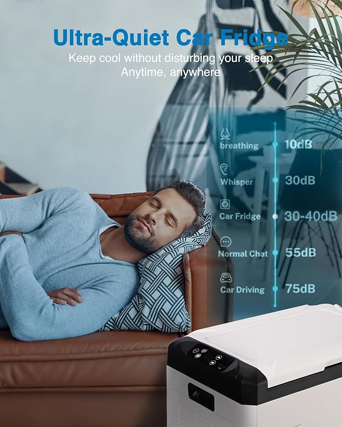 - ULTRA-QUIET OPERATION: Enjoy uninterrupted sleep with our 45dB ultra-quiet operation, quieter than your car's AC. Designed with an anti-vibration system, this portable fridge keeps running smoothly even on bumpy roads or during off-road adventures.