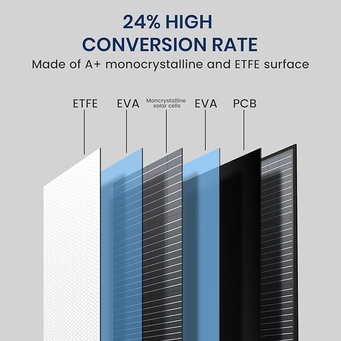 - 【DURABLE AND WATERPROOF】 This foldable solar panel utilizes advanced monolithic lamination technology, high quality ETFE material, UV resistant EVA and high efficiency solar cells. Made of A+ monocrystalline silicon, it effectively converts solar energy into electricity with a conversion rate of up to 24%. Compared with other PET solar panels, it is durable and reliable with up to 95% light transmission, which is enough to extend the life of the solar panel.