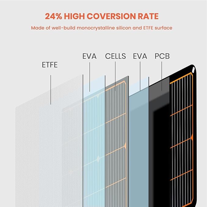 - 【INTELLIGENT SOLAR POWER】: The FlexSolar portable solar panel made of A+ grade monocrystalline solar cells achieve a conversion rate of 24%,ETFE lamination improves performance and durability over most solar panels, extending the life of the panel.It also provide the over charging ,over heating and short-circuit protection.you can make the most of the sun and covert the sunlight into clean energy. (Note: The panel does not store power, but it can charge devices directly when exposed to sunlight.)