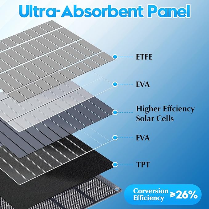 - 【Durable & Waterproof】: Advanced lamination technology and ETFE coating material make the solar panel durable. The special polymer surface protects the portable foldable solar panel from occasional rain or wet fog, this feature can withstand tearing and bending better than traditional panels. Cover with dust-resistant durable oxford cloth. It can also be used as an emergency power source at home when there is an unexpected power outage.