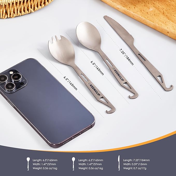 - 【Portable & Compact】 Measuring 6.46" x 1.42" x 0.08" and weighing only 0.56oz, this titanium flatware is ultra-light and compact, perfect for daily carry or outdoor adventures. Featuring a keychain hole, it can be easily attached to a carabiner, lanyard, or backpack without taking up space, or slipped into your pocket for convenient use anytime