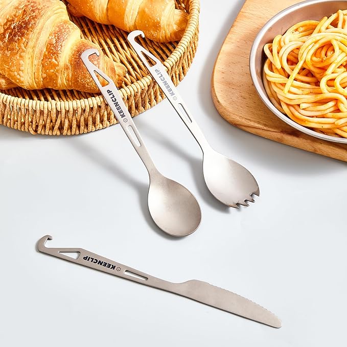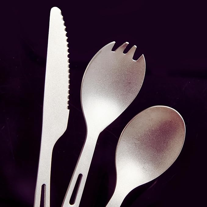 - 【2-in-1 Design】 This titanium spork and spoon features a unique "J"-shaped handle, allowing easy hanging on a lanyard after washing. It also doubles as a bottle opener, perfect for opening beer, soda, and more. Ideal for daily use or outdoor activities like backpacking, camping, hiking, traveling, and picnics