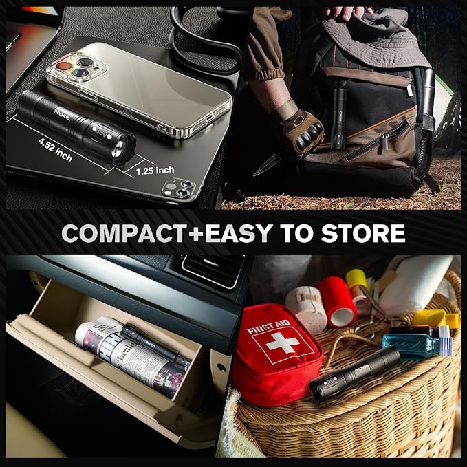 - Portable Small Flashlights: Our tactical flashlight is remarkably portable, measuring just 4.52*1.25 inches, and a lightweight of just 0.17 lb, which fits perfectly in your coat pocket, car, and hand; Compact and easy to carry; Ideal for various indoor and outdoor activities, this compact flashlight is perfect for camping, hunting, dog walking, cycling, or dealing with a power outage