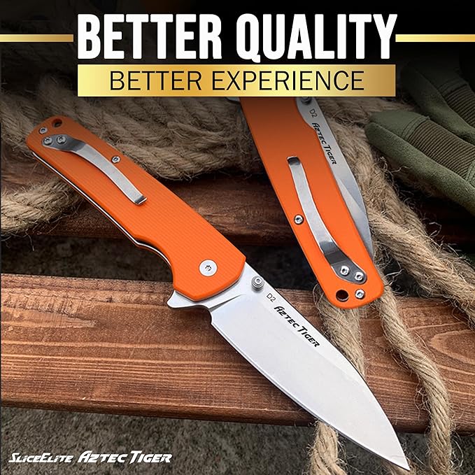 SliceElite 3.6-Inch Aztec Tiger Folding Knife | Pocket Knife with Orange G10 Composite Handle, D2 Steel Drop Point Blade & Stainless Steel Pocket Clip | EDC Gear Knife with Button Lock for Outdoor Use