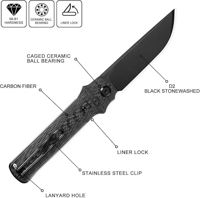 Petrified fish PFB04 Tena Folding Knife, 3.82" D2 Black Stonewashed Blade Carbon Fiber Handle Pocket Knife for EDC Camping Outdoor (Carbon Fiber Black Stonewashed)