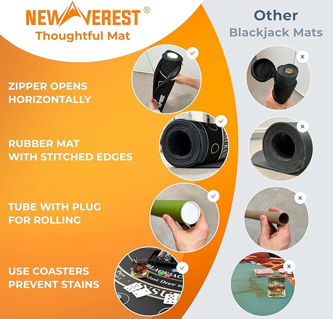 - Portable easy-pack zipper bag - Our bag's horizontal zipper design simplifies storing your blackjack table mat. Just roll, place, and zip, avoiding the hassle of drawstring bags where you have to awkwardly stuff the mat in from the top. The Newverest travel-friendly bag is all about simple, secure storage.