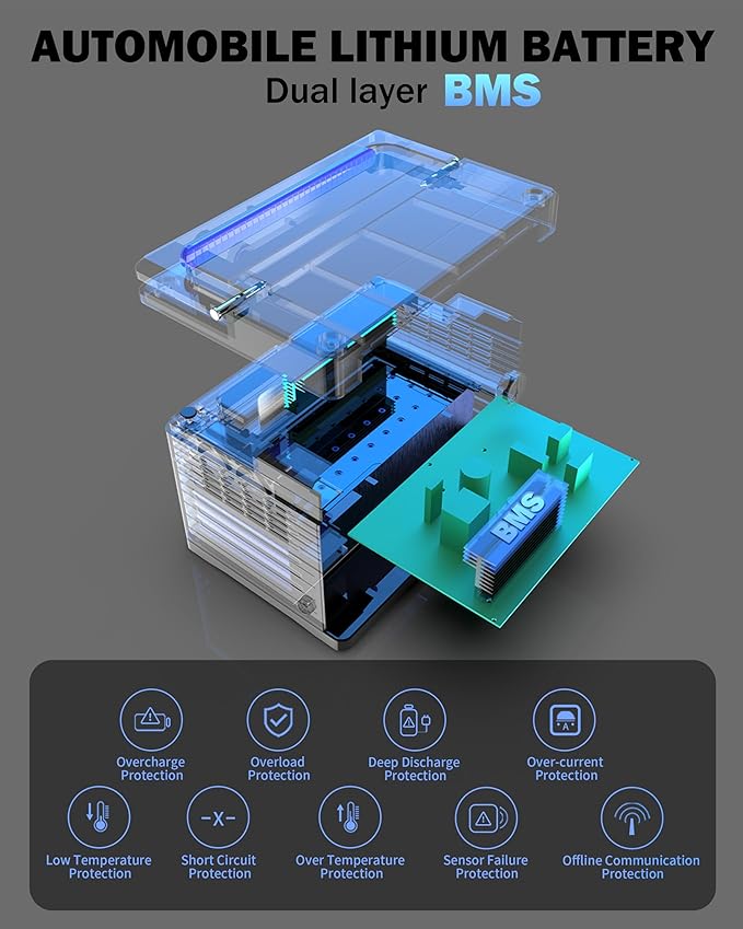 - BMS Protection: Experience peace of mind with our advanced BMS system. It ensures multiple-layer safety for your battery with Overload, short circuit, Overcharge , over discharge, over temperature, low temperature , over current, sensor disconnection, communication offline protection,and more.