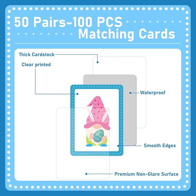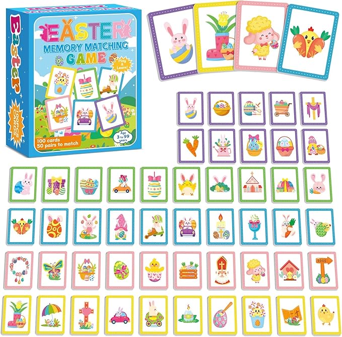 - 100PCS matching cards: 100 cards (50 pairs) feature delightful Easter-themed images such as Easter egg, cross, bunny, and more. Each card is vibrantly colored with clear, detailed patterns, ensuring an engaging play experience. The set comes with a durable storage box for easy organization and long-lasting use, making it great for repeated play. Your little ones will immerse themselves in the fun while enjoying endless entertainment and educational benefits.