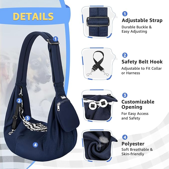 SlowTon Dog Carrier Sling - Thick Padded Shoulder Strap Adjustable Dog Carriers for Small Dogs, Puppy Carrier Purse for Pet Cat with Front Zipper Pocket Safety Belt Machine Washable (Dark Blue, L)