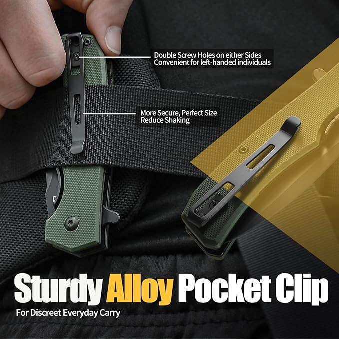 - 2. Premium Blade: Blade made of high quality D2 stainless steel, with excellent performance, high hardness, making it outstanding when performing tasks. This folding knife with the handy pocket clip is the ideal option for everyday carry.