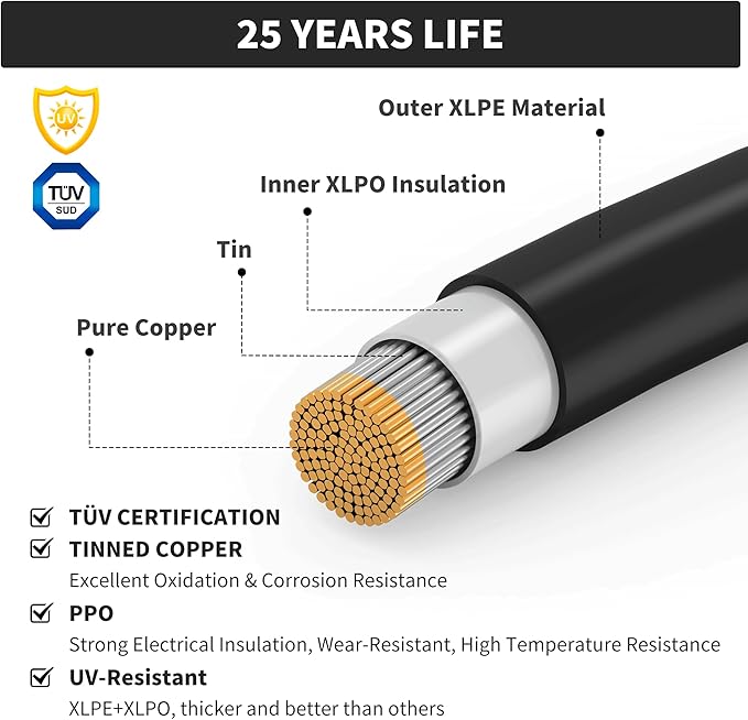 - 【10AWG Solar Cable】Professional solar panel wire (20FT Tinned copper), certified with TÜV, CE, and RoHS, delivers superior conductivity, oxidation resistance and thermal stability over pure copper, supporting 30A rated current and 1000V DC rated voltage with minimized power loss and improved efficiency.