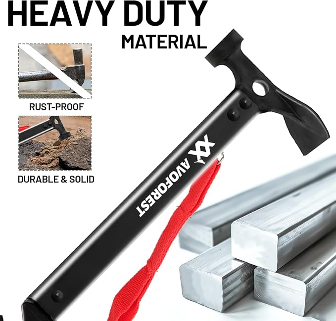 - Multifunctional Tool:Tent hammer head drives stakes effortlessly. Reverse hook extracts stubborn anchors, while the camping shovel tackles campsite leveling, firepit prep, and debris clearing.