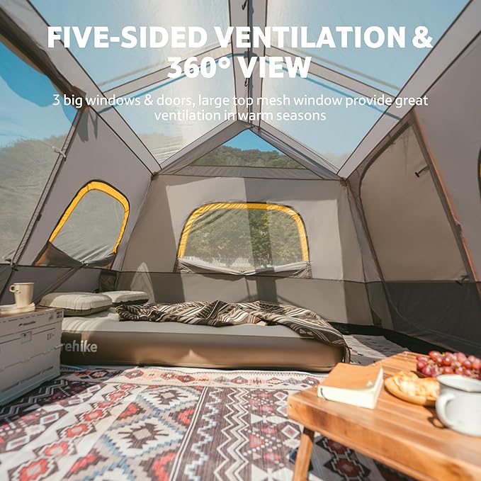 - Great Ventilation & Good View: It is a good ventilation tents for camping ,with five-sided ventilation: 3 big windows enjoy more air flow and great view, 3 large doors for easy access and ventilating, top mesh skylight also provide a great night view when open the rainfly.