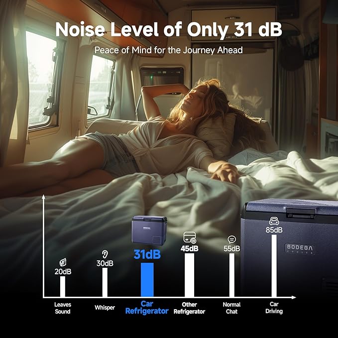 - 【𝗨𝗹𝘁𝗿𝗮-𝗤𝘂𝗶𝗲𝘁,𝗟𝗼𝘄 𝗡𝗼𝗶𝘀𝗲𝘅≤𝟯𝟭𝗱𝗕】This Portable Car Refrigerator With new compressors and soundproofing technology,operates at just 31 dB (library-quiet),Ideal for outdoor camping, enjoying quiet evenings and lunch breaks