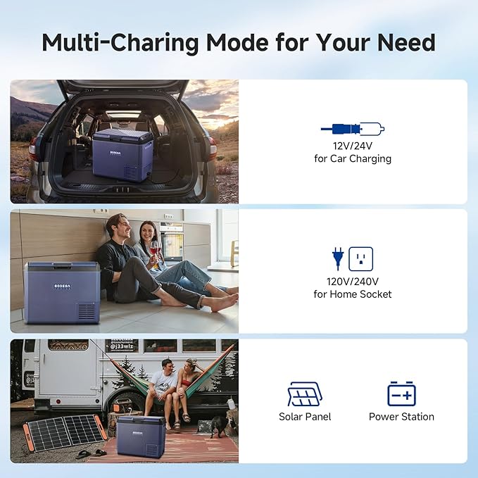 - 【𝗙𝗶𝘁 𝗧𝗿𝗶𝗽𝗹𝗲 𝗣𝗼𝘄𝗲𝗿: 𝗔𝗖/𝗗𝗖/𝗣𝗼𝗿𝘁𝗮𝗯𝗹𝗲 𝗕𝗮𝘁𝘁𝗲𝗿𝘆】 Versatile charging options! Compatible with 110V-220V outlets, 12/24V car sockets, and solar generators. BodegaCooler electric cooler works for camping, home, or emergencies.(Package included: 1*dc power cord, 1*ac power cord, 1*user manual)