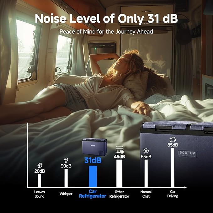 - 【LOW NOISE&Anti-Shock】Conquers bumpy roads! Featuring a shock-absorbing design that works reliably at a 45° angle, it's perfect for trucks, RVs, or uneven terrain. The in-vehicle refrigerator stays stable on bumpy rides, reduces rattles, and operates at less than 31dB, giving you a quiet ride!