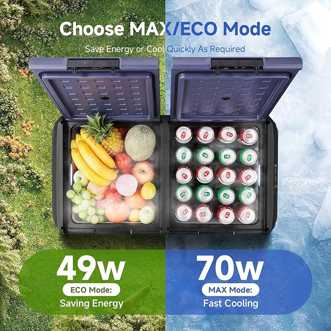 - 【FAST COOLING & ENERGY EFFICIENCY】BODEGACOOLER 12 volt refrigerator features an advanced variable frequency compressor,Cold cutting time is 22% faster than other products . featuring an ECO mode for energy savings and a MAX mode for rapid cooling, with an average energy consumption of just 60W