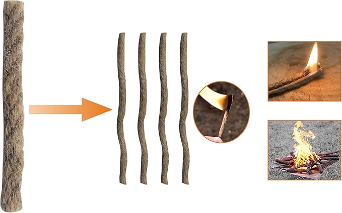 - 【Waterproof and windproof:】The 20 wax- infused natural hemp cords work in all weather conditions, it is 0.3” x 2.6”, it can be 4 stands. Each strand can burn 5 minutes or above. Unwind the braided fire ropes and fray them by twisting the fibers a part until they are very fine and fluffy. The cord quickly start a fire whether with its rainy, windy, snowy or sunny. It is also WATERPROOF!
