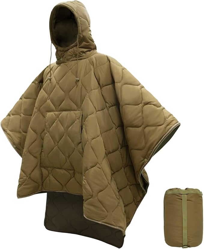 - PONCHO & SLEEPING BAG - When it as a hooded poncho liner, it has a large pocket for storage, hood adjustment strap and snaps to keep the cold wind out, and 4 buttons on the body sides to secure the poncho in place. And zipped up to transform it into a lightweight sleeping bag. Our poncho sleeping bag poncho provides maximum functionality, whether you're camping, hiking or on a tactical mission.