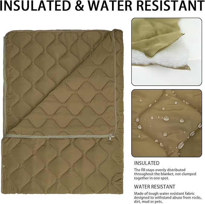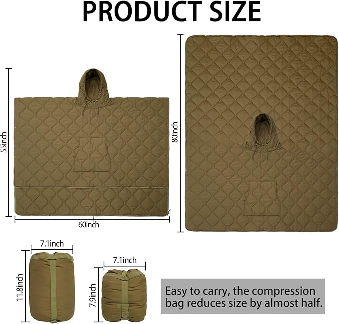 - PACKABLE & PORTABLE- The poncho liner measures 5x6.5ft /60x78.7in , enough space for four people to sit and two to lie down. Comes with a compression bag with heavy-duty clasps that can be compressed to a small size, easy to keep in your car or on camping trips.