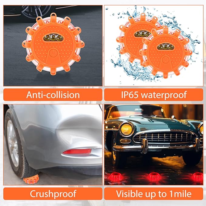 - Waterproof, Crushproof and Magnetic: each flashing warning flare is coated with a waterproof material TPR to ensure electronic safety; Our road emergency lights can bear the weight of ordinary vehicles and are not easily crushed, suitable for distributing among family members