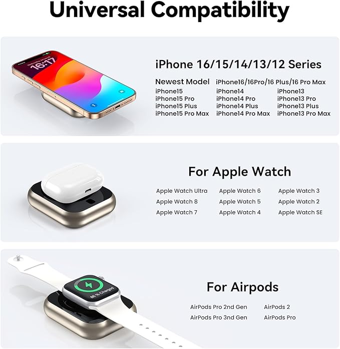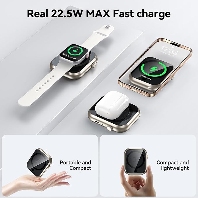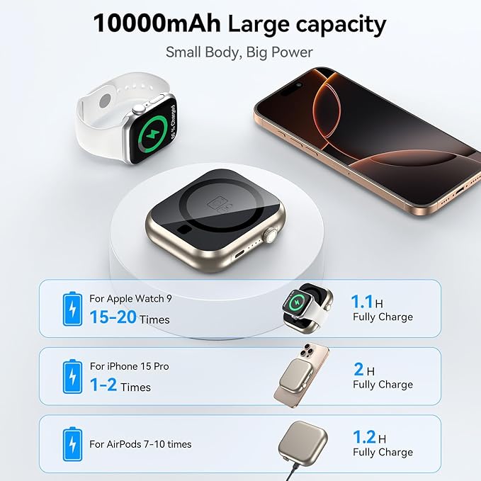 - 【Fast Wireless & Wired Charging】Magnetic power bank supports 15W Max wireless charging for smart phone(for iPhone 12-16 series support 7.5W Max wireless charging);5W Max wireless charging for Airpods 2/Airpods 3rd Gen/Airpods Pro/Airpods Pro 2nd Gen;3W Max Wireless Charging for Apple Watch series(Ultra/8/7/6/SE/5/4/3/2/1).Type-C port supports 22.5W Max fast input/output charging;