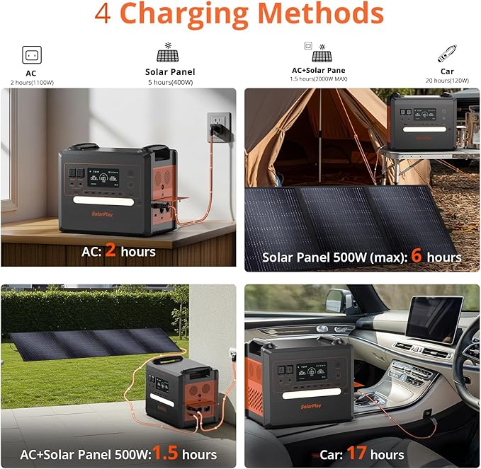 - 【1.5Hr ULTRA-FAST DUAL CHARGE & SOLAR-READY】 Recharge 0-100% in 1.5hrs via AC+solar dual input (1100W max), 2x faster than similar solar generators. Compatible with SolarPlay 200W panel for off-grid energy. Adjustable input (300W-1100W) ensures safe charging from cars/generators.