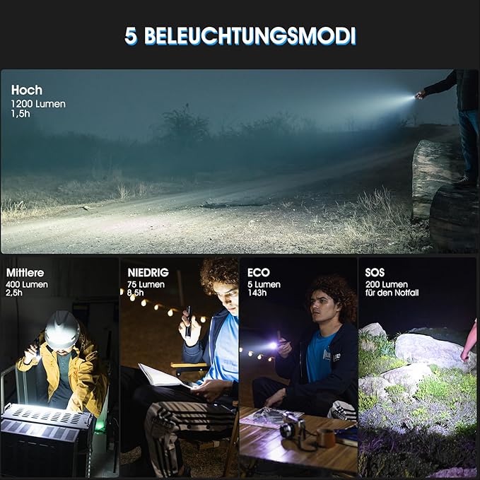 - Super Bright 5 Modes: WUBEN L50 tactical flashlight developed with P9 LED imported from Germany, emits bright light up to 1200 lumens and reaches nearly 588 ft. Featured with 5 adaptable light modes: High / Medium / Low / Eco / SOS(With memory function), last as long as 143 hours (Eco)