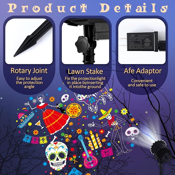 - Easy Installation: our Day of the Dead projection lamp comes with insertion stakes, composed of 2 parts, allowing you to install it easily, when plugged in, it lights up immediately; Drive the stake into the ground and enjoy your spellbinding light show