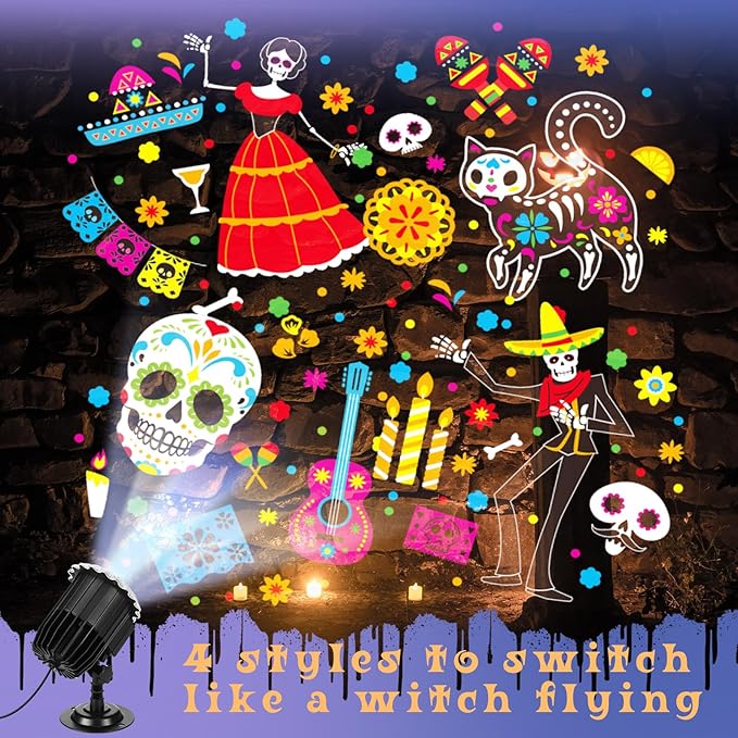 - Holiday Supplies: with an active and lively Day of the Dead themed pattern, such as cat, skeleton and guitar, this Day of the Dead holiday projector brings the holiday essence to your home; Its vibrant and colorful film allows you to create an enchanting environment