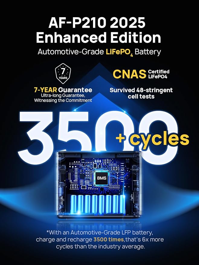 - 【10-Year Long-Lasting LFP Battery】AF-P210 Portable Power Station with LiFePO4 Battery: 3500+ Cycle Life, 10-Year Durability for Safe & Reliable Outdoor Energy Solutions.