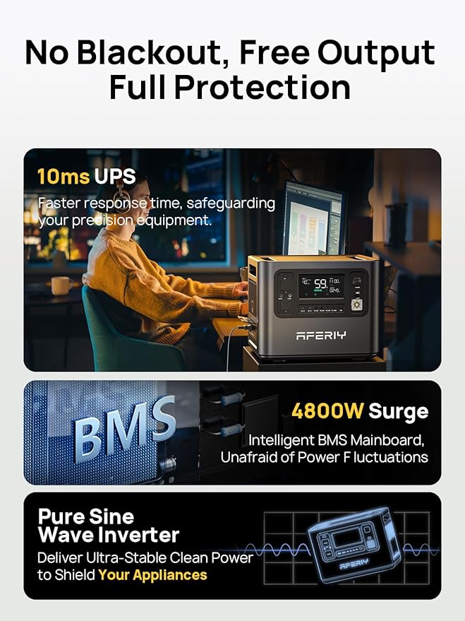 - 【Pure Sine Wave AC Input & Output Only】 The AFERIY Solar Generator packs a powerful 2400W inverter (4800W surge). It exclusively uses pure sine wave AC for both input and output. This delivers power identical to standard wall outlet power, ensuring safe operation and protecting your sensitive electronics from damage.