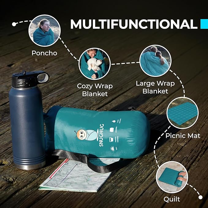 - Multi-Use Versatility - This camping quilt can easily convert into a hands-free poncho, keeping you warm while you cook, read, or relax. Use it as a campfire wrap, picnic mat, car emergency blanket, or travel comforter.