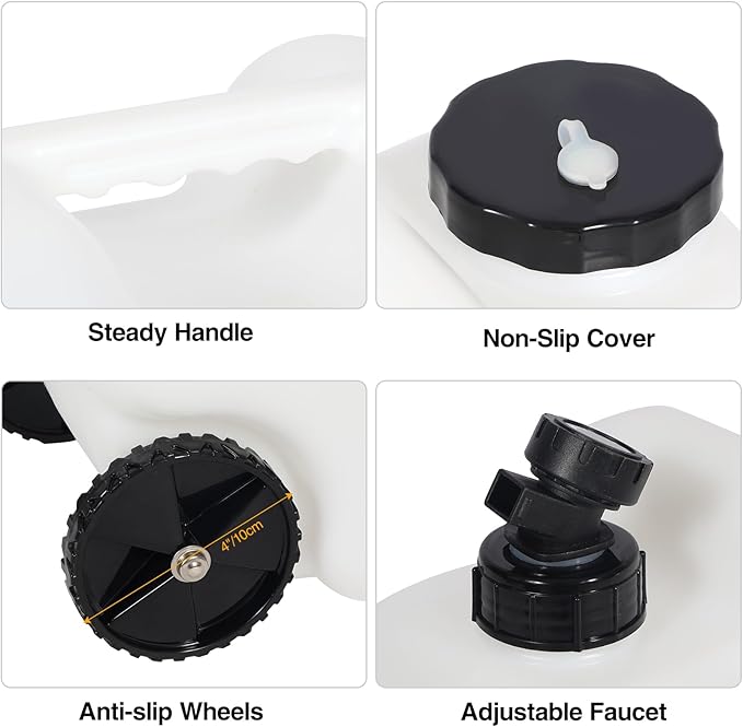 - Effortless Transportation with Built-In Wheels & Folding Handle Say goodbye to struggling with heavy water jugs! Our rolling water container glides smoothly over any terrain, while the ergonomic folding handle ensures easy maneuvering—perfect for camping trips, outdoor events, or emergency preparedness. Even kids can help transport water effortlessly!