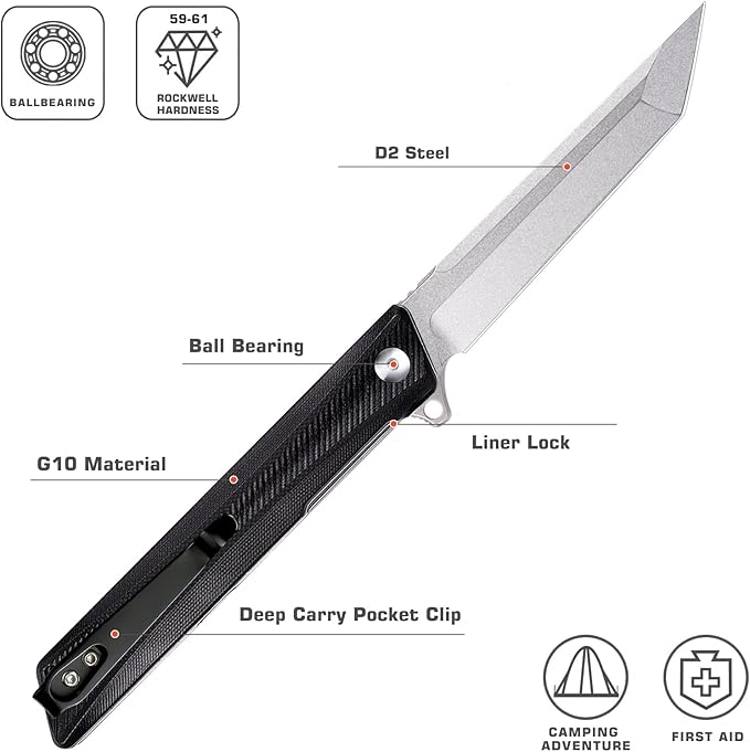 Pocket Knife GD22K, Flipper Open D2 Steel Tanto Folding knife with Durable G10 Handle,Men Women Everyday Carry EDC Knife,Sharp Camping Hiking Daily Work Knives