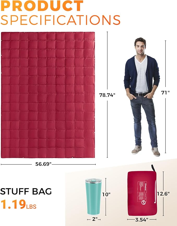 - LIGHTWEIGHT & PORTABLE WARMTH ON-THE-GO: This camping blanket unfolds to 69"L x 53"W and weighs just 1.37 lbs—lighter than a water bottle, giving you generous coverage without the bulk. It packs down to a compact 13" x 8.7" x 6.3" in the included stuff sack, making it easy to carry on hikes, backpacking trips, road adventures, or travel.