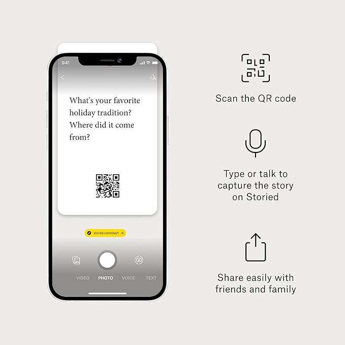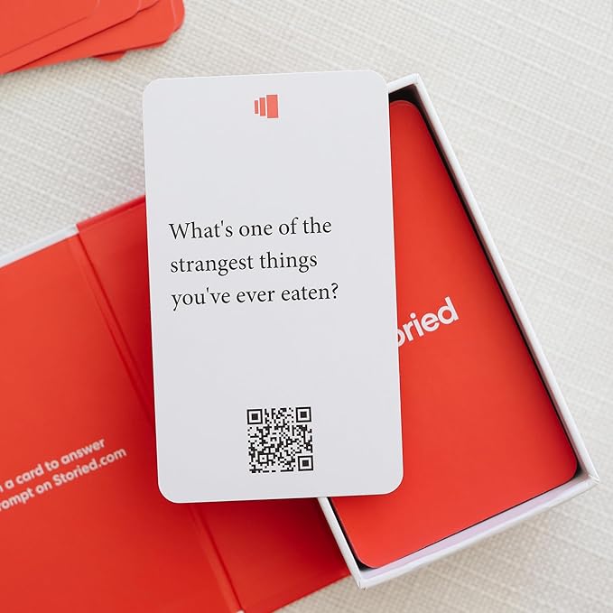 - 78 STORY STARTER CARDS WITH QR CODES – Thoughtfully crafted conversation prompts make it easy to capture life stories from loved ones. Each card includes a QR code for instant digital recording. Perfect for family gatherings, holidays, or one-on-one conversations with grandma, grandpa, mom, or dad.